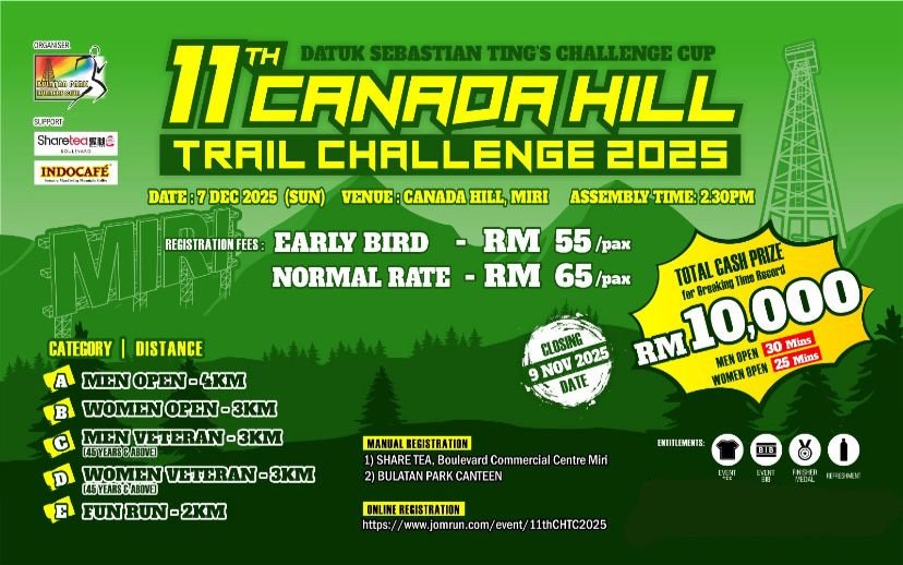 11th Canada Hill Trail Challenge 2025 is a rugged trail running event on 7 December 2025 at Canada Hill, Miri (Sarawak). Organized by JomRun, this edition offers runners an adventurous experience through natural terrain—complete with entitlements such as event tee, finisher medal, and light refreshments.