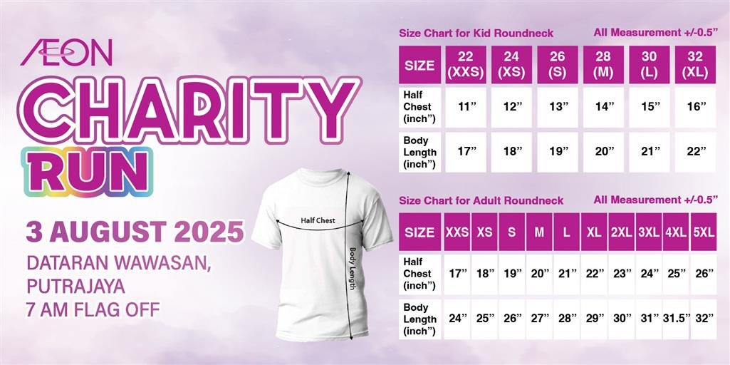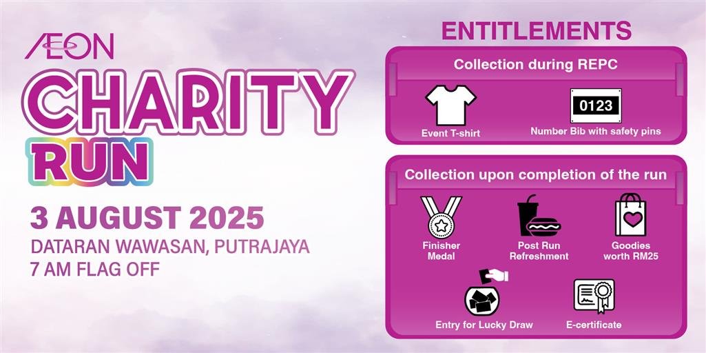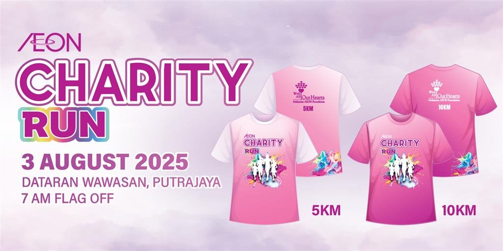 The AEON Charity Run 2025 is a family-friendly fundraising run organized by the AEON Foundation. 🏃♀️🧡 Set for Sunday, August 3, 2025, starting at 7:00 AM at Dataran Wawasan, Precinct 2, Putrajaya, it invites participants of all ages to “run, have fun, create smiles, and run for a cause”—with early‑bird registration offering RM5 e-vouchers. The event marks AEON’s annual charitable effort and is open for registration from May to August, aiming to support those in need through community participation.