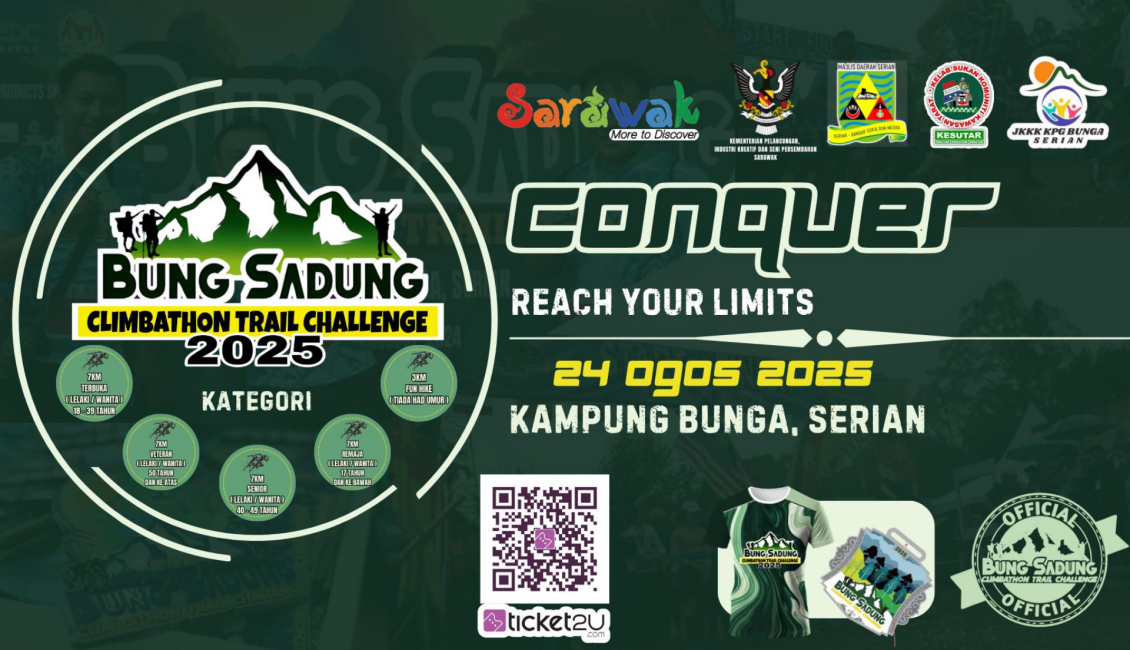 The Bung Sadung Trek Climbing Challenge 2025, also known as the Climbathon Trail Challenge, is a thrilling mountain-running event set for 24 August 2025 in Kampung Bunga, Serian, Sarawak. Participants tackle Mount Sadung’s natural trails, with options ranging from a competitive 10 km uphill race to a 6 km veterans/juniors category and a 3 km fun hike, all aiming for the 728 m summit. Organized by the local JKKK and Serian District Council to promote eco-tourism, fitness, and community bonding, the event features finisher medals, certificates, refreshments at the summit, and healthy camaraderie in a scenic forest setting.