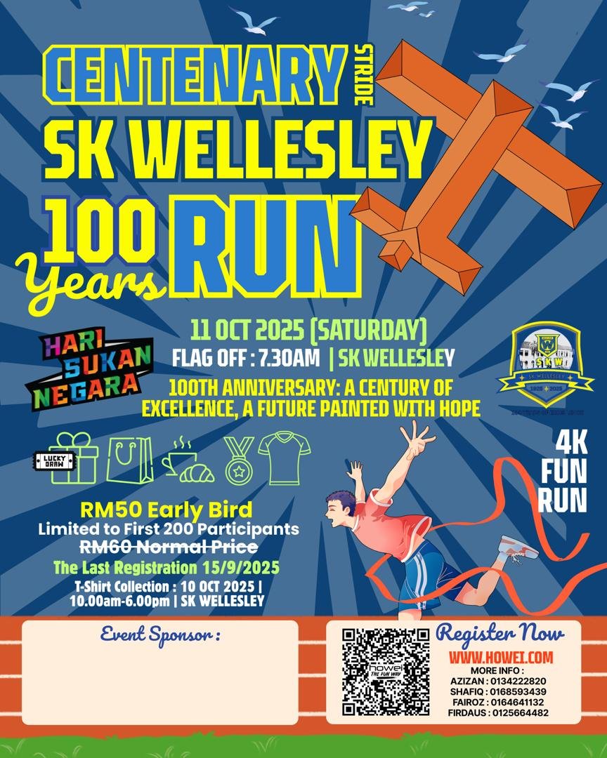 Centenary Stride SK Wellesley 100 Years Run meraikan 100 tahun legasi SK Wellesley dengan larian istimewa. Sertai komuniti, nikmati pengalaman larian bersejarah sambil memupuk gaya hidup sihat dan semangat kebersamaan.