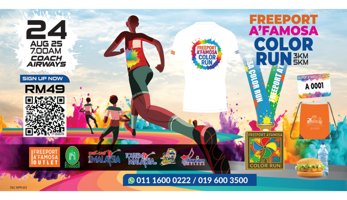 The Freeport A’Famosa Colour Run 2025 is a vibrant family-friendly 5 km fun run scheduled for 24 August 2025 at the scenic Freeport A’Famosa Outlet in Melaka. Participants are playfully doused in non-toxic colored powder at checkpoints, transforming the run into a joyful celebration of color and community. With race kits, finisher medals, complimentary Marrybrown meals, lucky draws, and a lively post-run color party, it’s the perfect event for all ages to enjoy fitness, fun, and festive vibes in a picturesque outlet setting.
