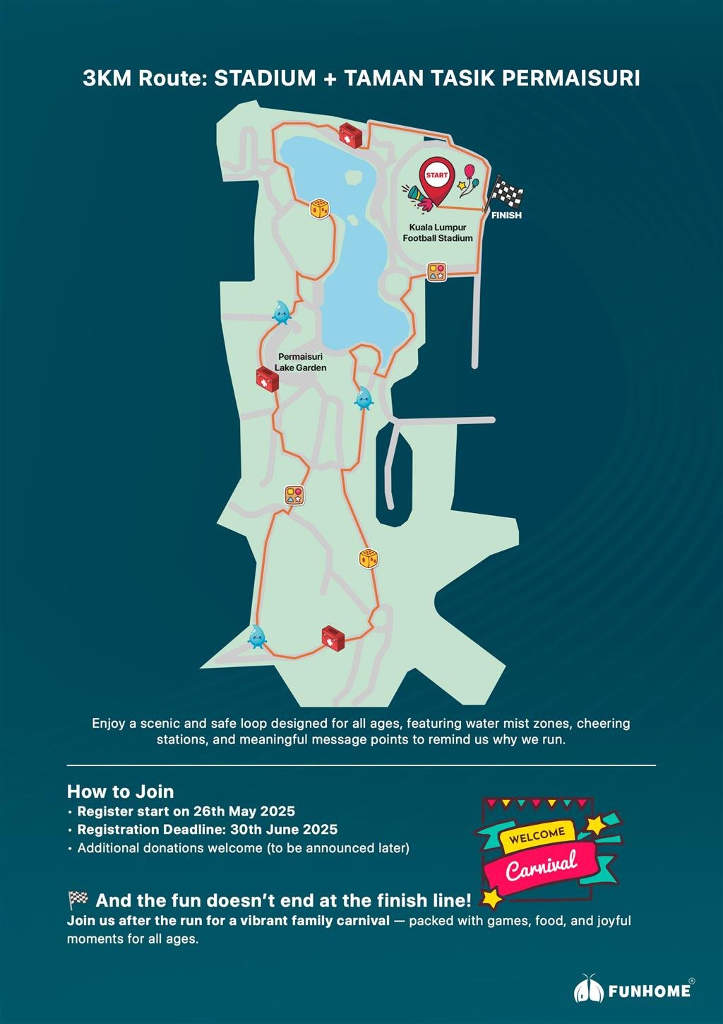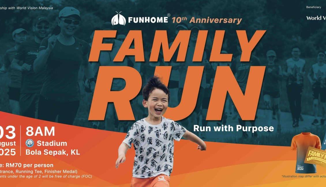 Fun Home 10th Anniversary Family Fun Run 2025 is a heartwarming 3 km family run held on 3 August 2025 at Kuala Lumpur Football Stadium. Organized in celebration of Fun Home’s 10th anniversary and in partnership with World Vision, the event aims to raise funds to sponsor 68 children—supporting access to education, clean water, nutrition, hygiene, and protection for one year.