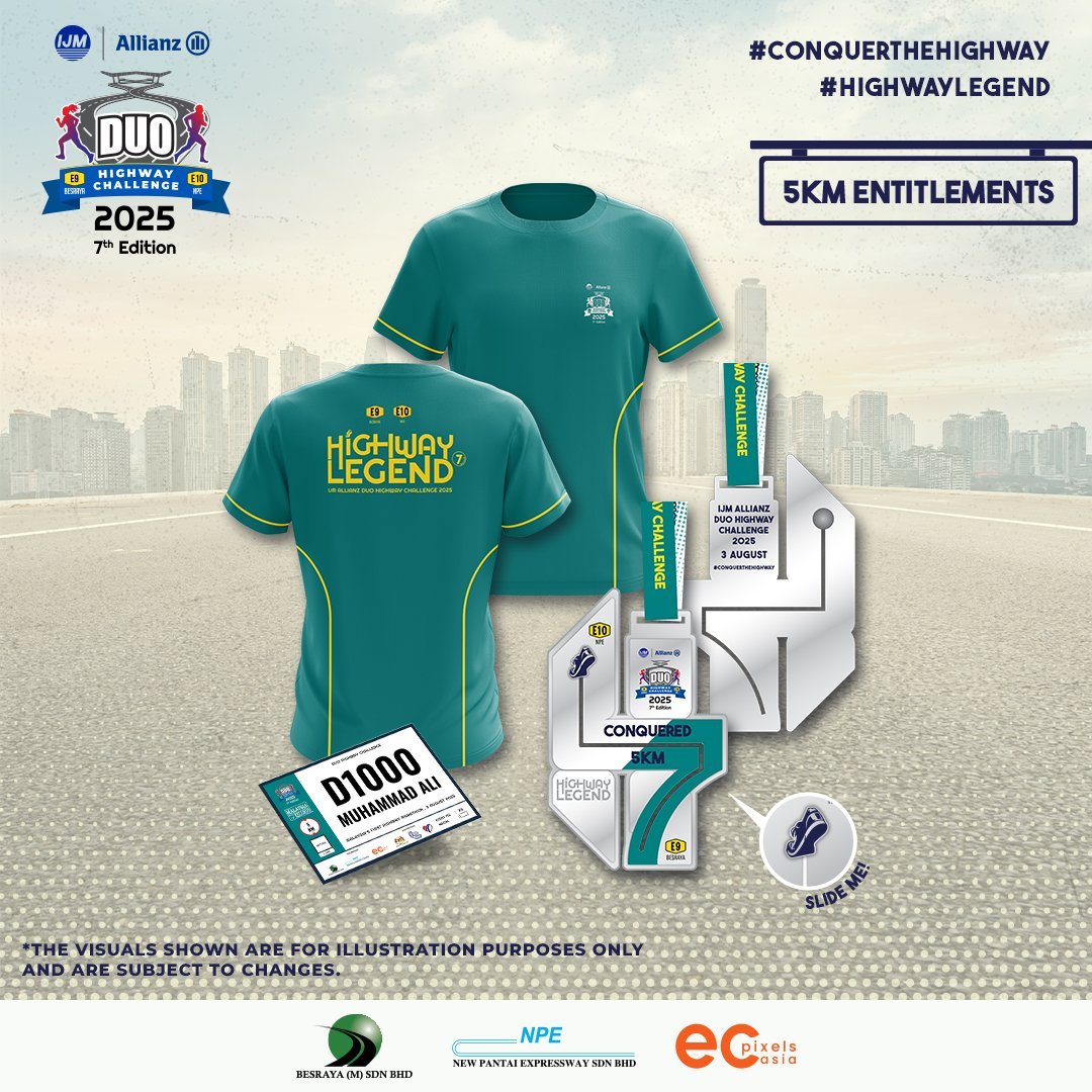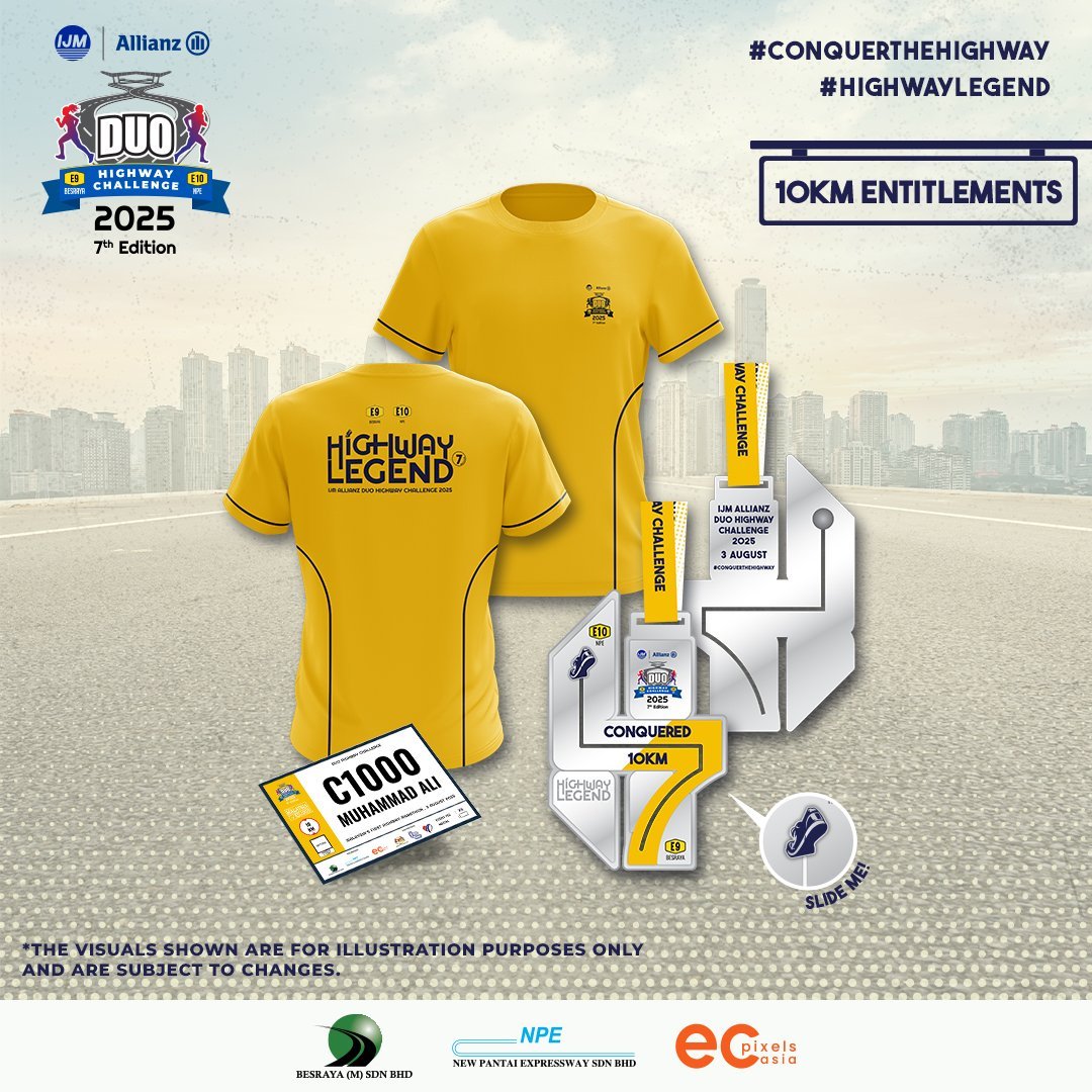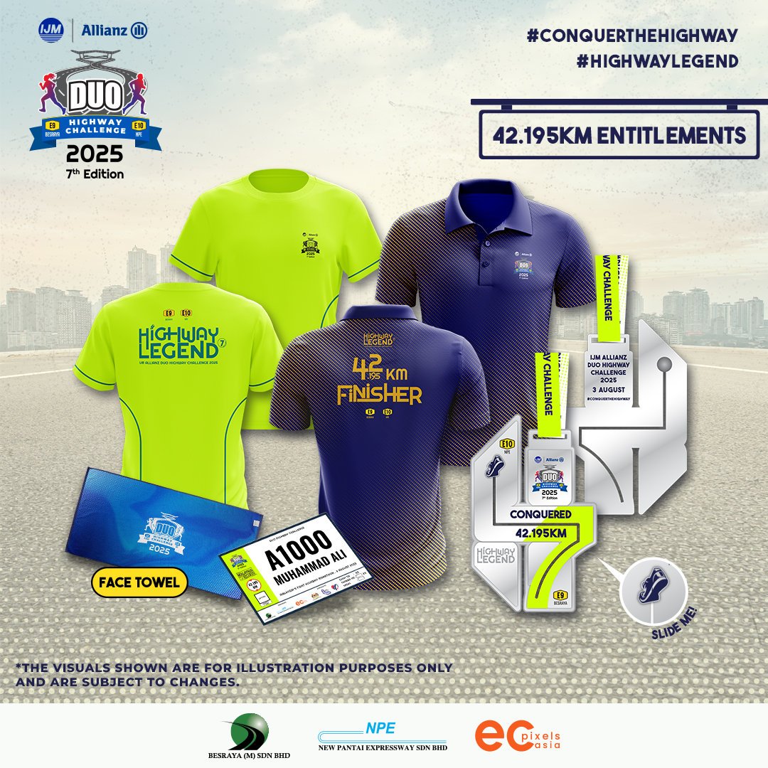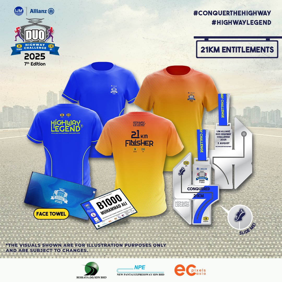 Asia’s first-ever duo highway running event, held on August 3, 2025, along the fully closed New Pantai Expressway (NPE) in Selangor, starting near Sunway Pyramid. Offering 5 km, 10 km, 21 km, and full marathon (42.195 km) categories, it provides runners a safe, vehicle-free highway experience. Highlights include exclusive finisher entitlements like slideable medals and face towels for 21 km and marathon participants, all in a professionally managed, highway-scale setting.