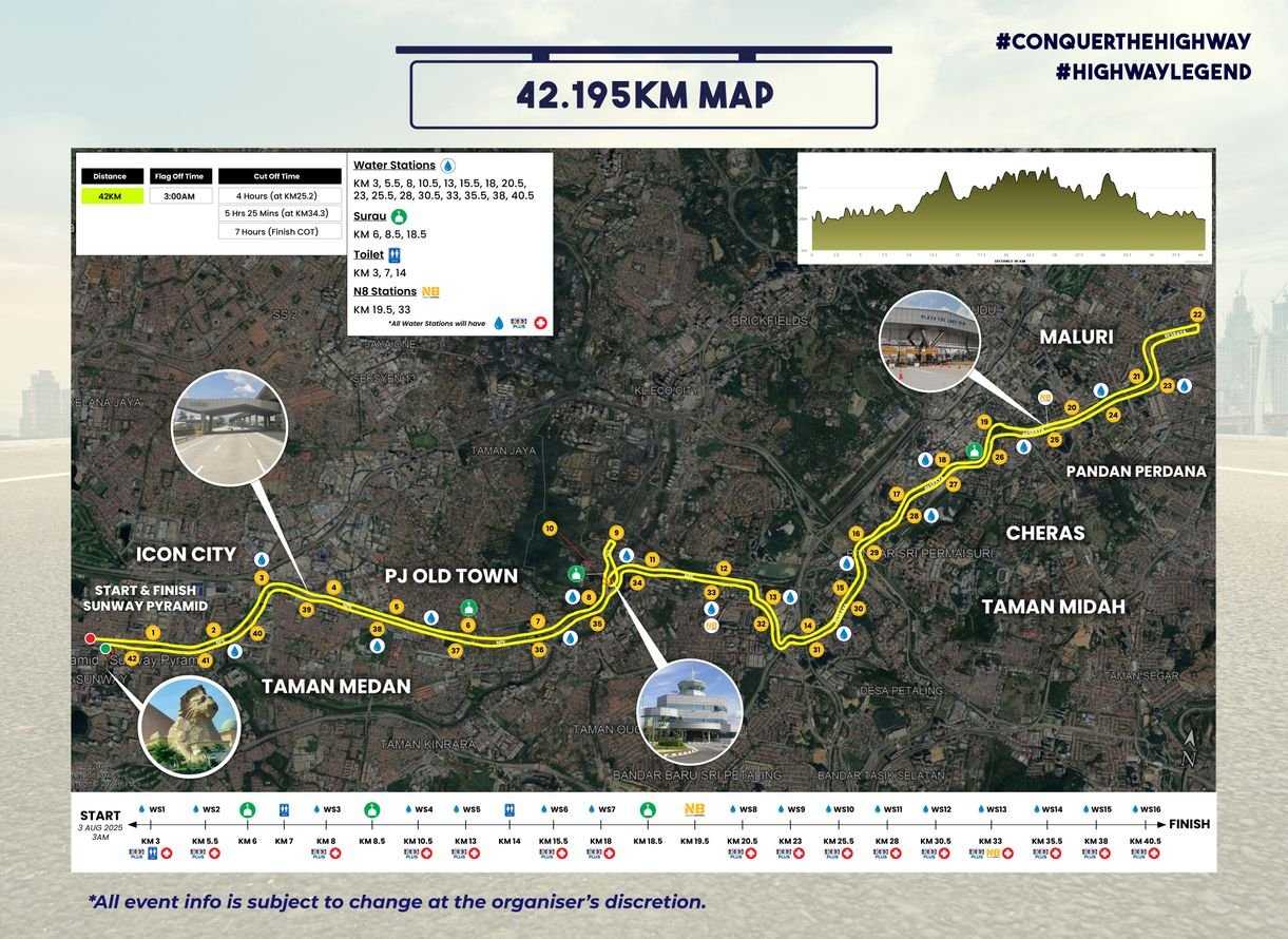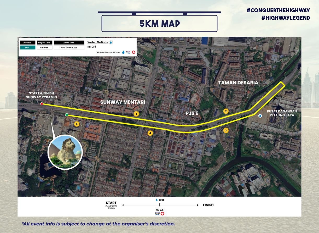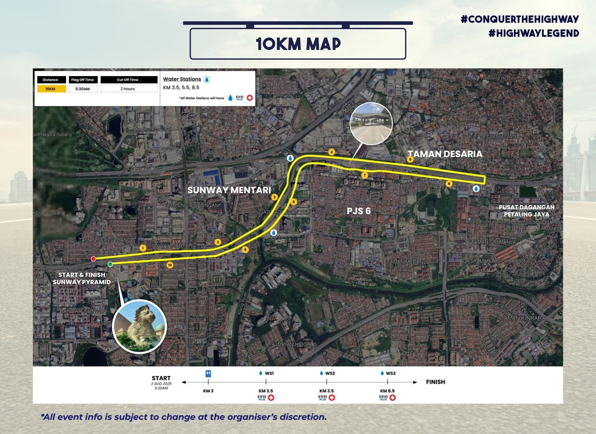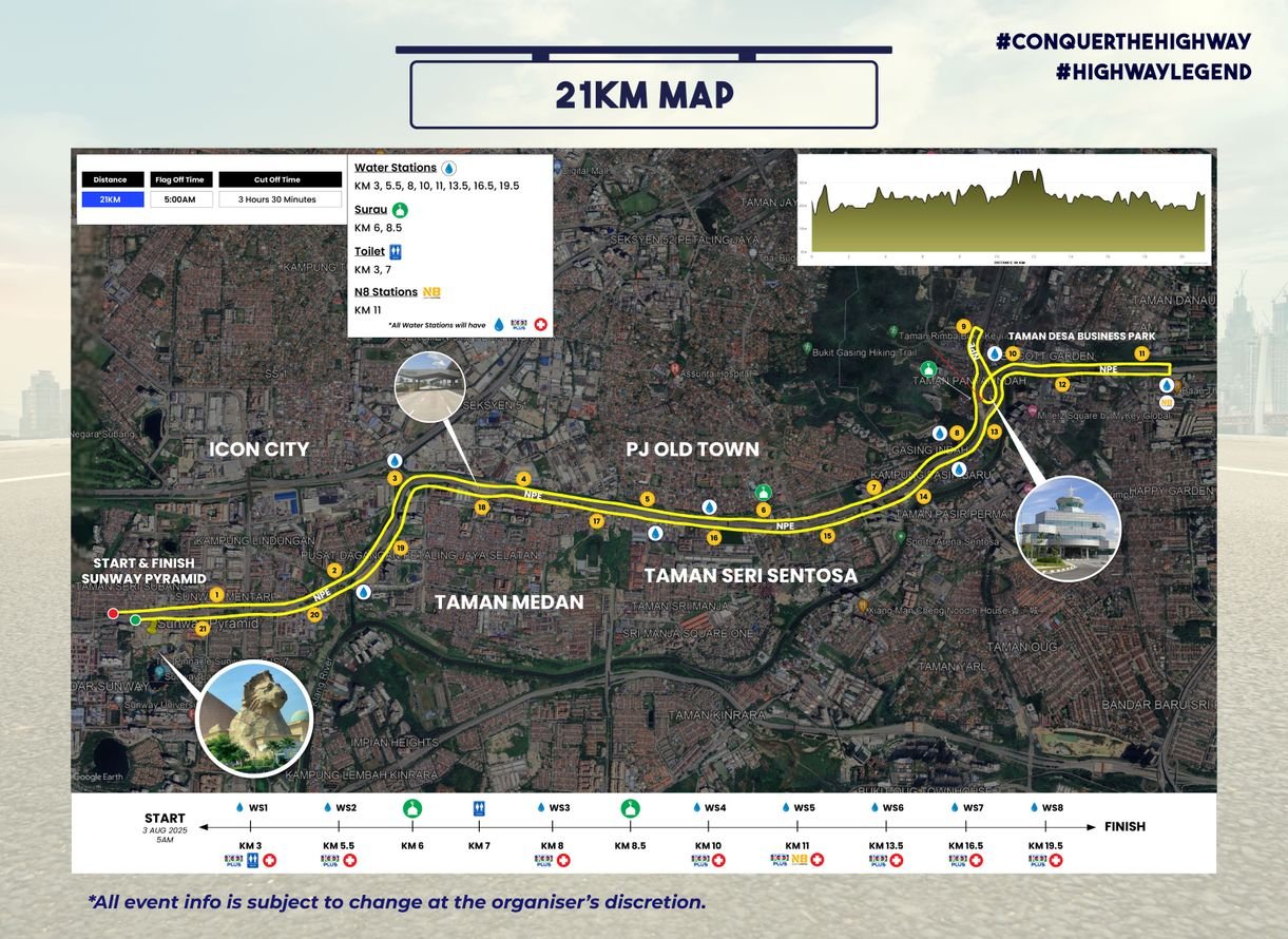 Asia’s first-ever duo highway running event, held on August 3, 2025, along the fully closed New Pantai Expressway (NPE) in Selangor, starting near Sunway Pyramid. Offering 5 km, 10 km, 21 km, and full marathon (42.195 km) categories, it provides runners a safe, vehicle-free highway experience. Highlights include exclusive finisher entitlements like slideable medals and face towels for 21 km and marathon participants, all in a professionally managed, highway-scale setting.