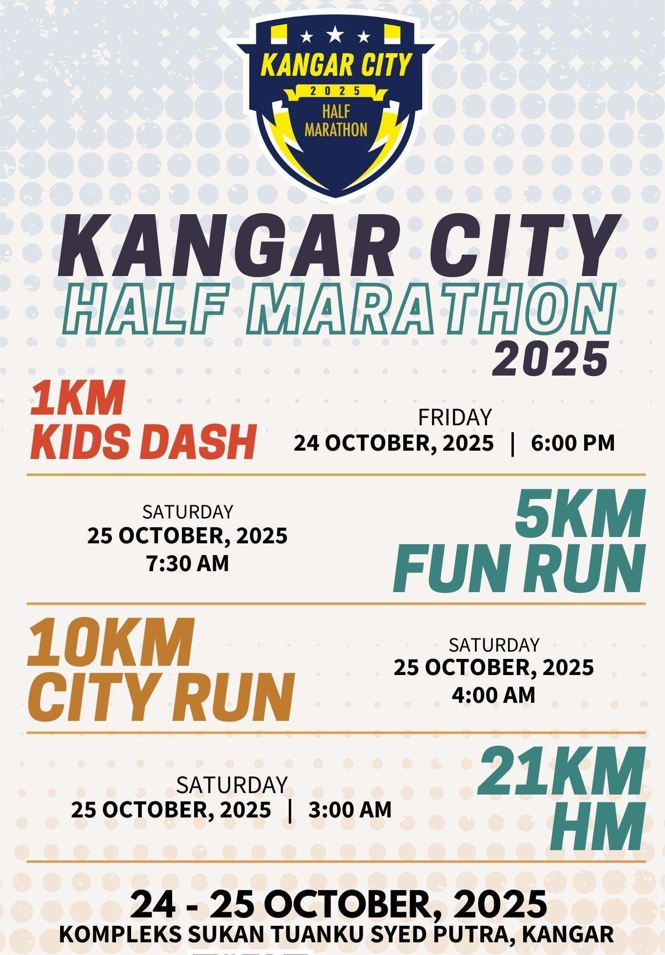 Kangar City Half Marathon 2025 takes place on 24 October 2025 at Kompleks Sukan Tuanku Syed Putra in Kangar, Perlis, and offers runners a dynamic half-marathon experience blending endurance, scenic city vistas, and local community energy.