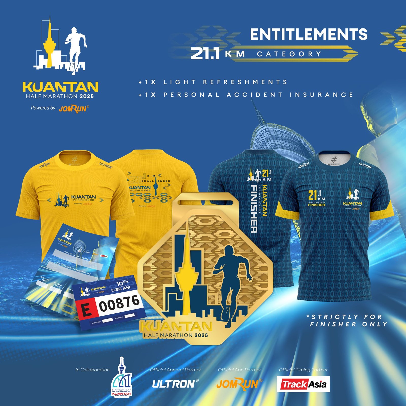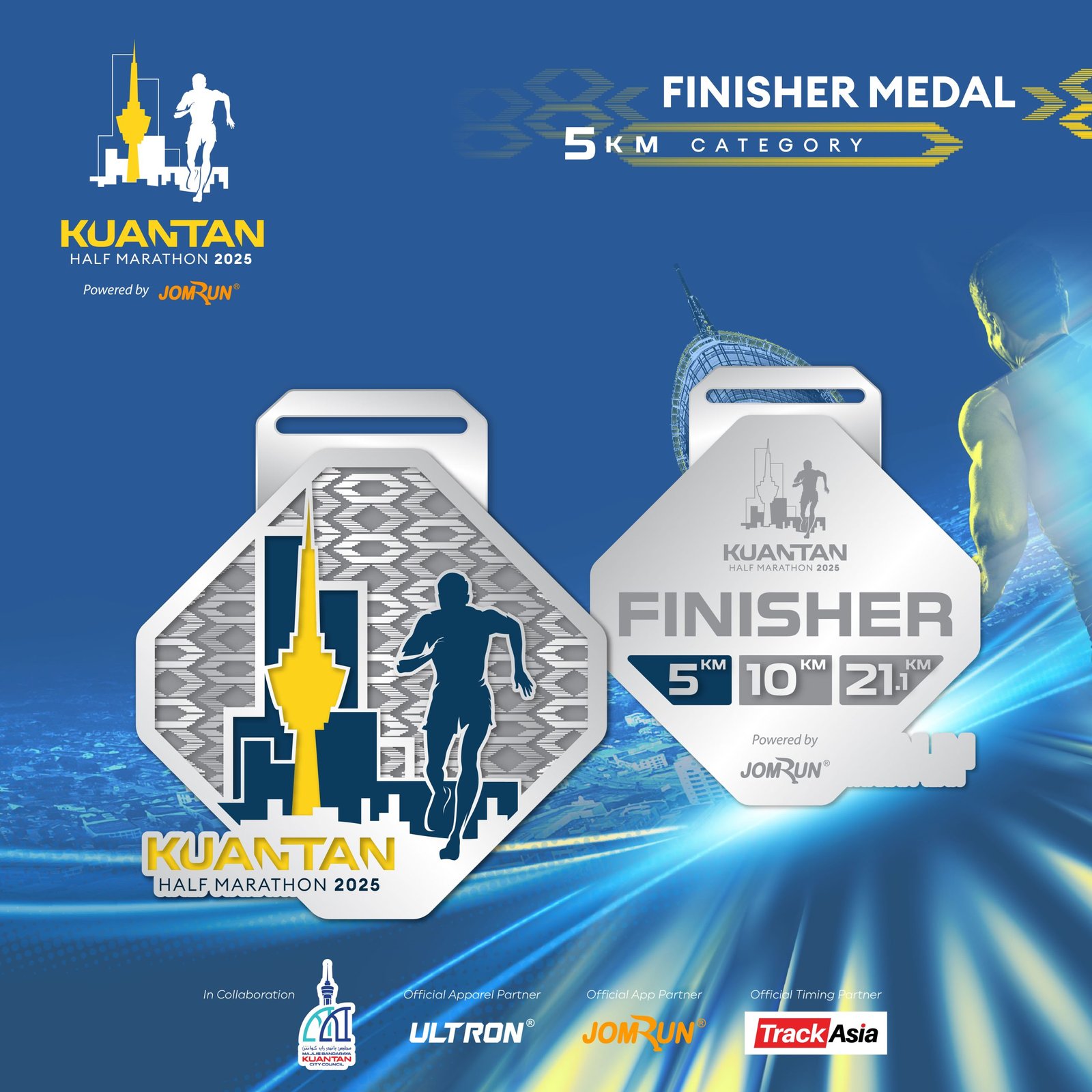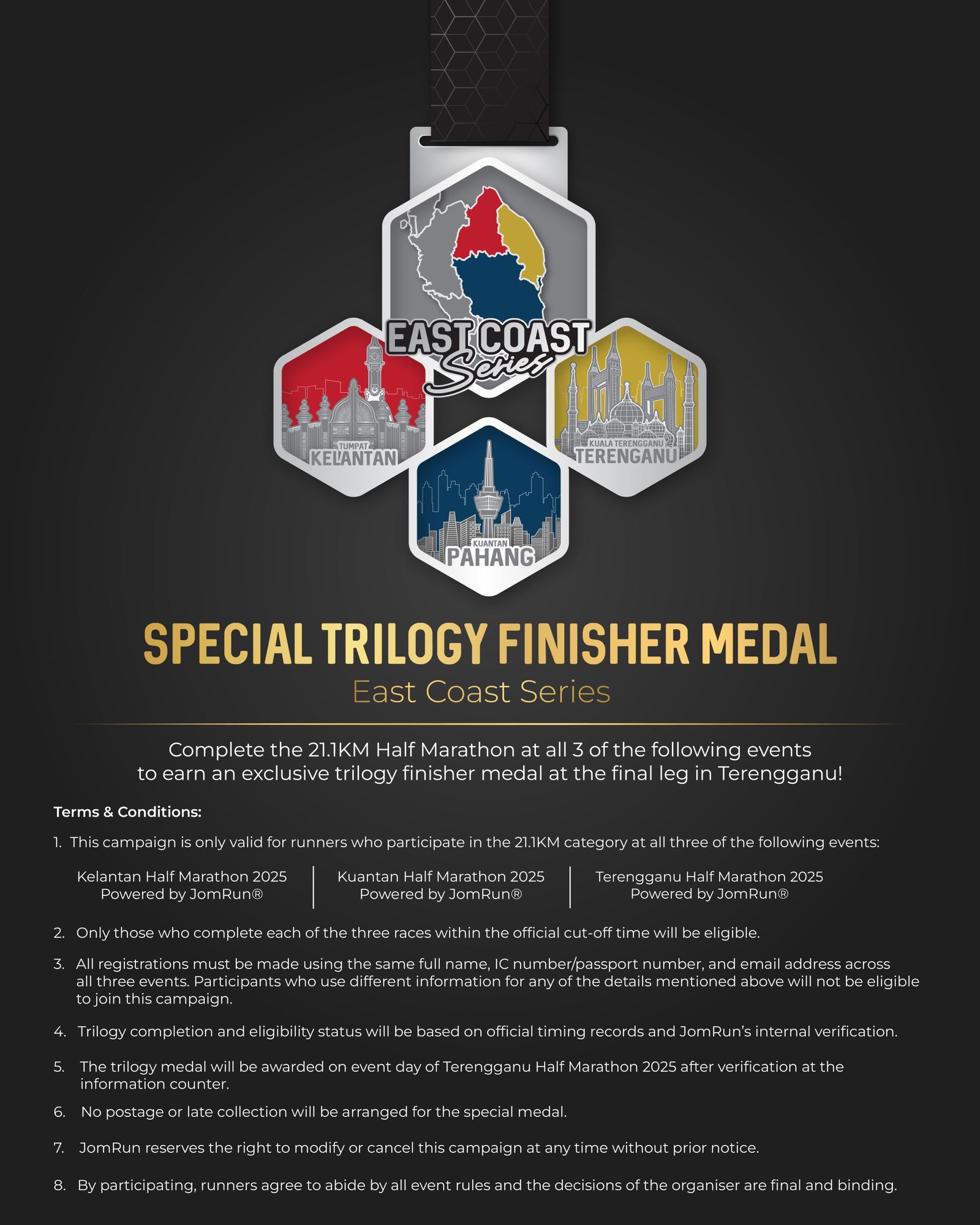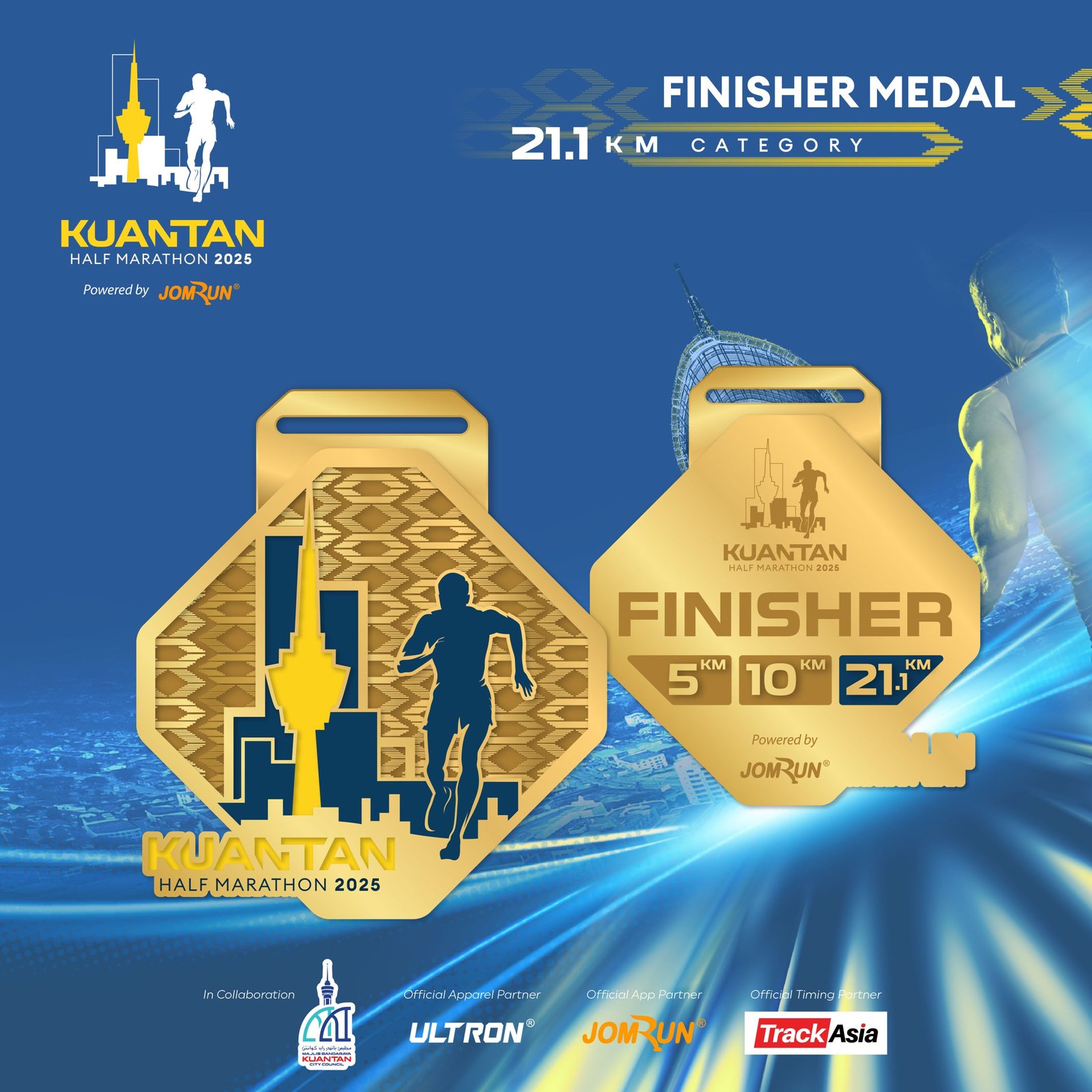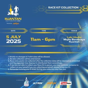 Kuantan Half Marathon 2025 Powered by JomRun® takes place on 6 July 2025 at Dataran Sayangi, Kuantan, starting bright and early at 4 AM. With 5 km, 10 km, and a competitive 21.1 km race featuring RFID timing, participants receive event-and-finisher jerseys, medals, e-certificates, refreshments, and insurance for a fully supported running experience.