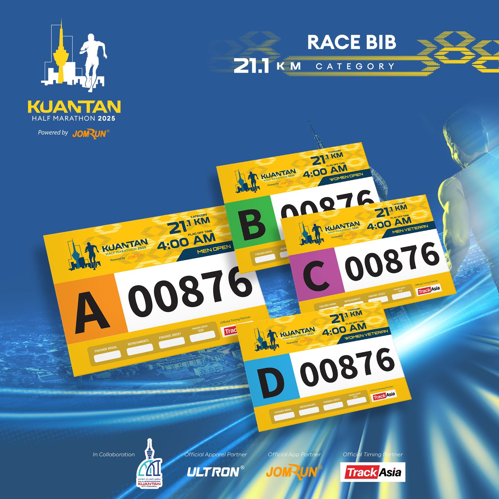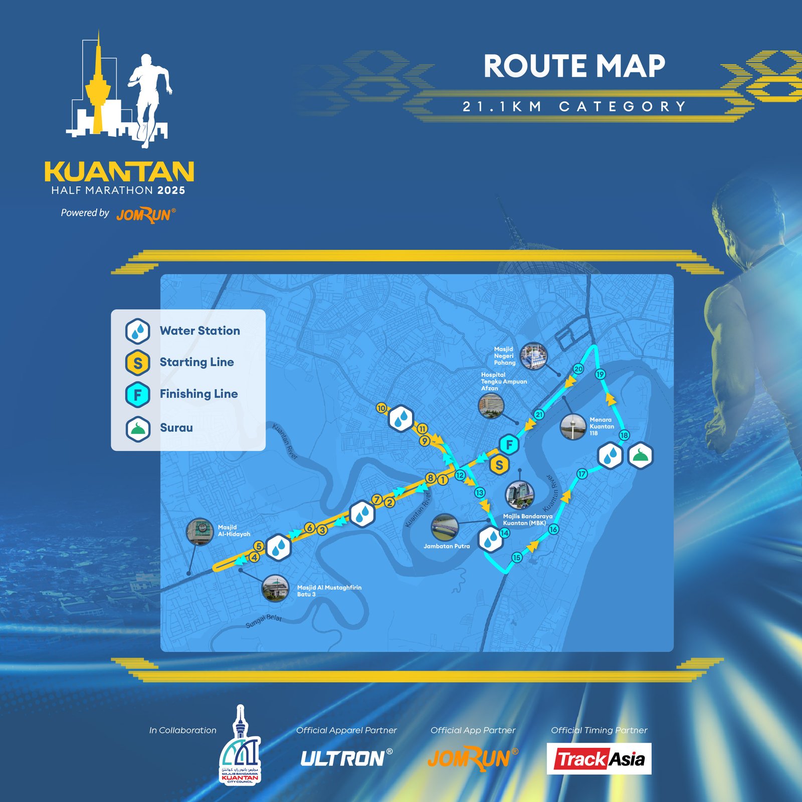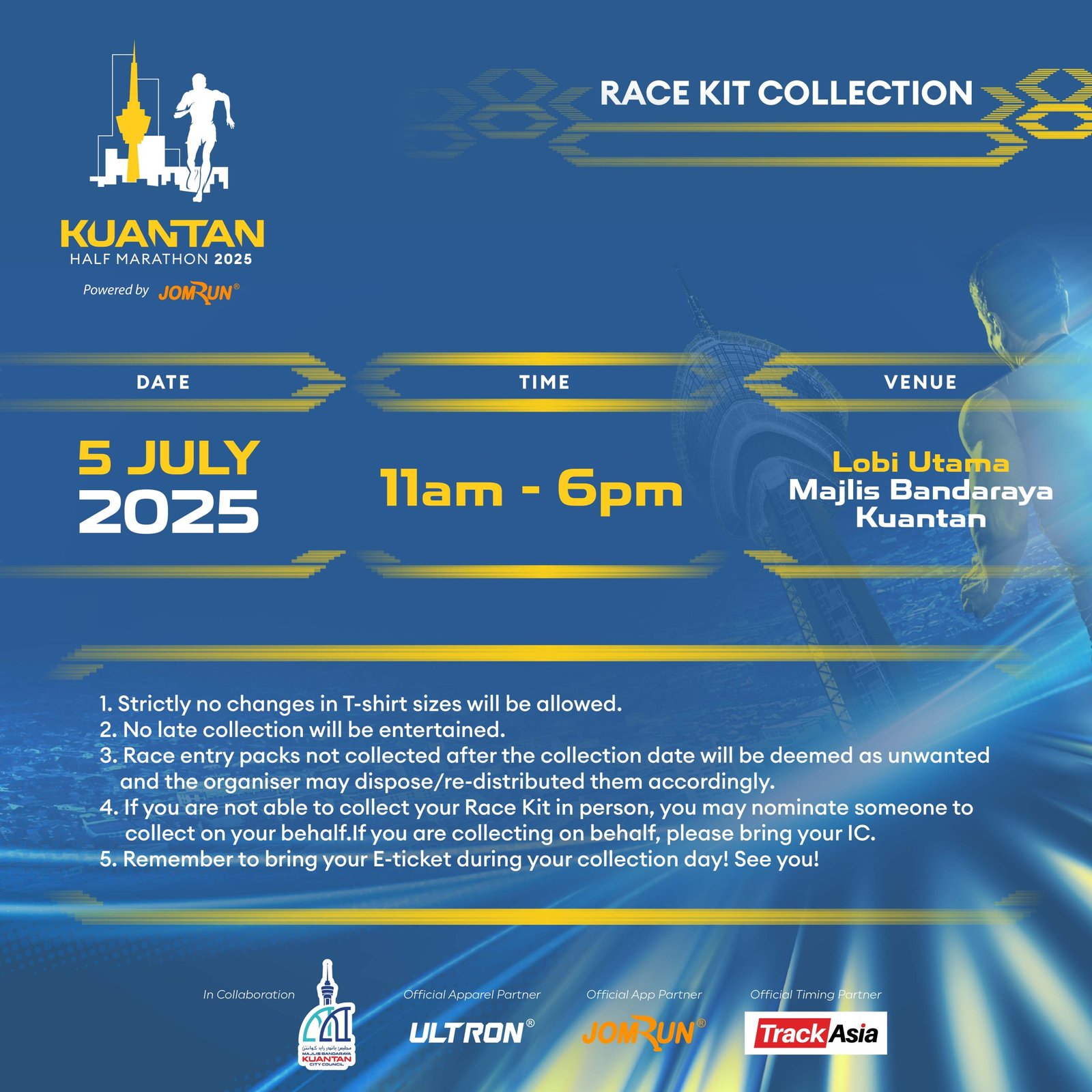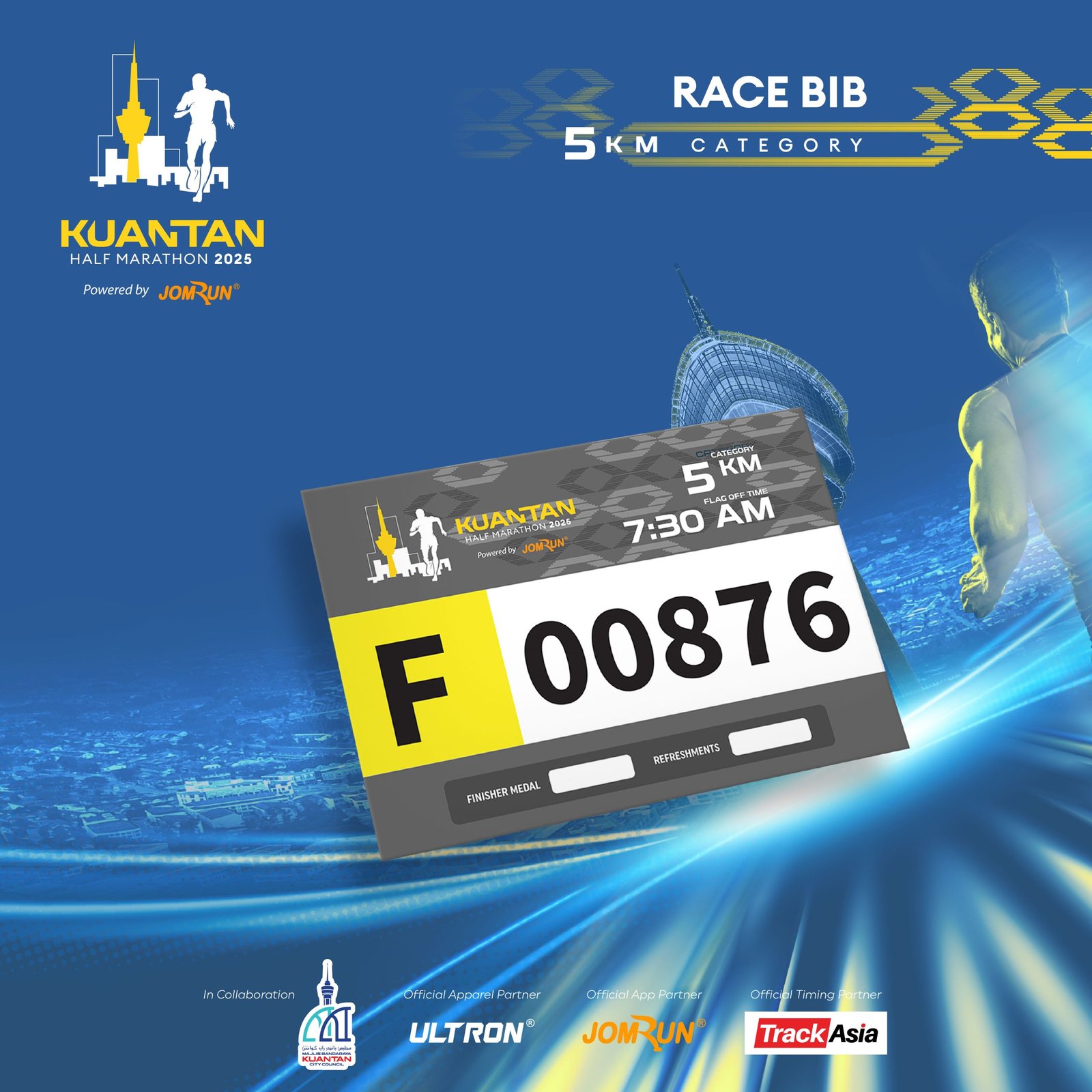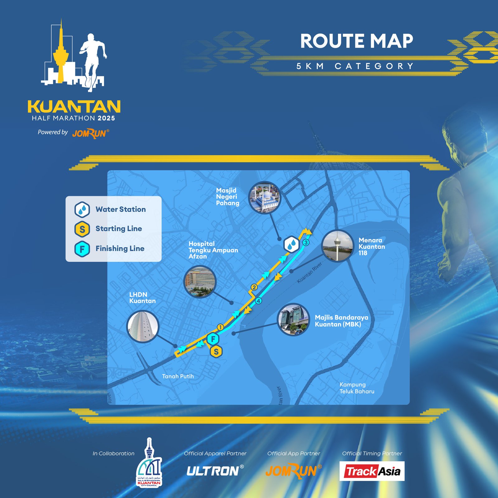 Kuantan Half Marathon 2025 Powered by JomRun® takes place on 6 July 2025 at Dataran Sayangi, Kuantan, starting bright and early at 4 AM. With 5 km, 10 km, and a competitive 21.1 km race featuring RFID timing, participants receive event-and-finisher jerseys, medals, e-certificates, refreshments, and insurance for a fully supported running experience.
