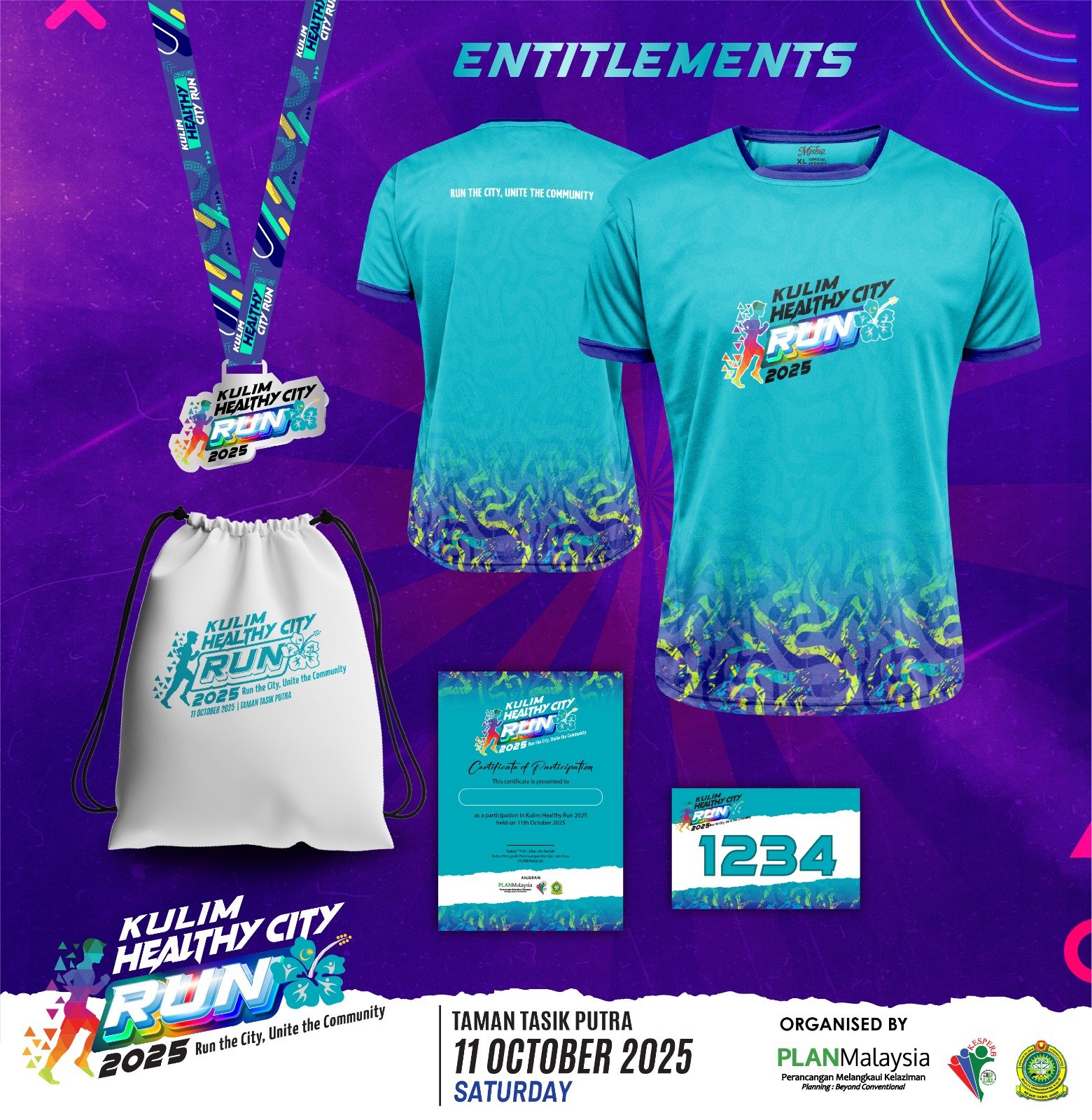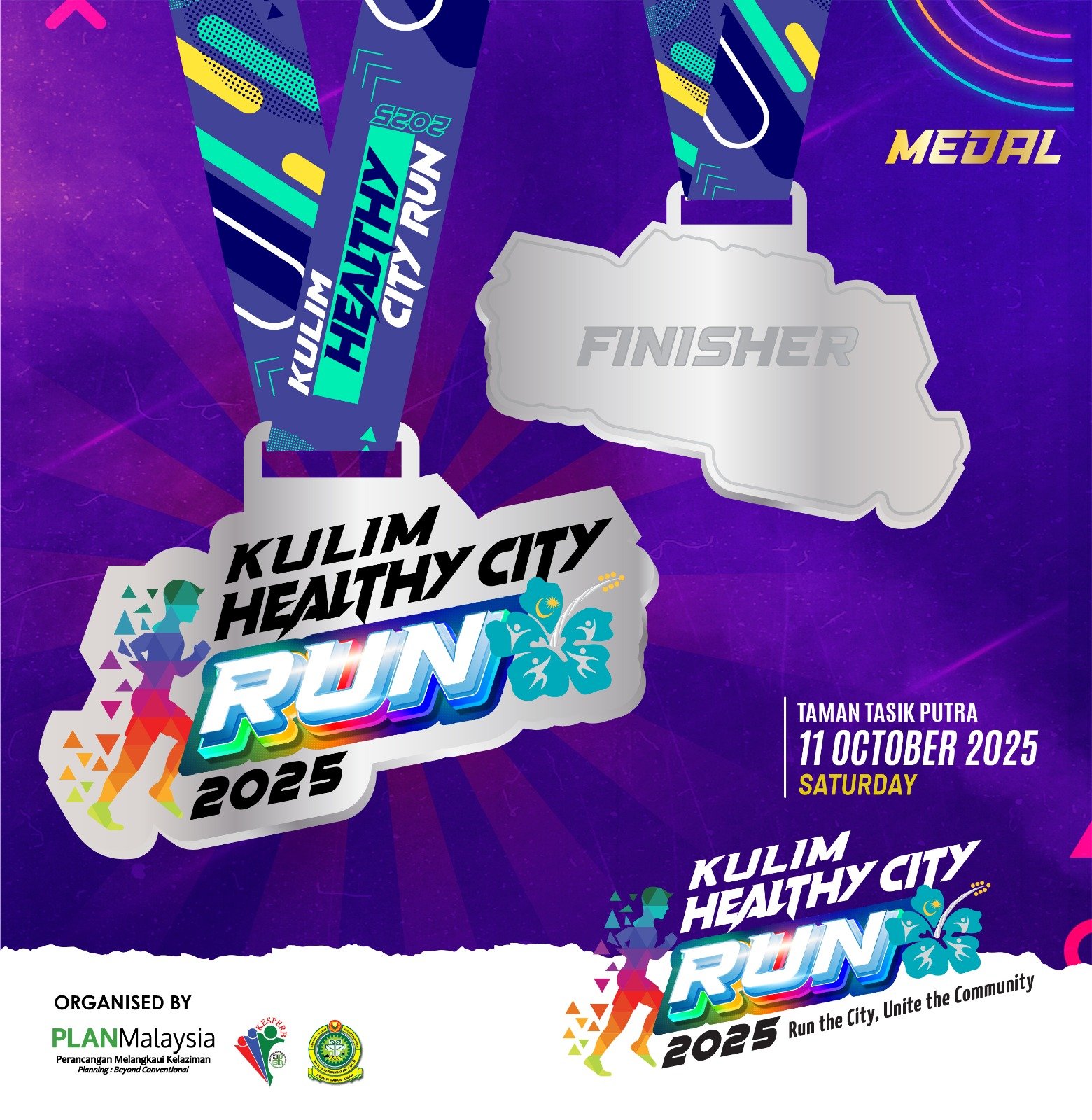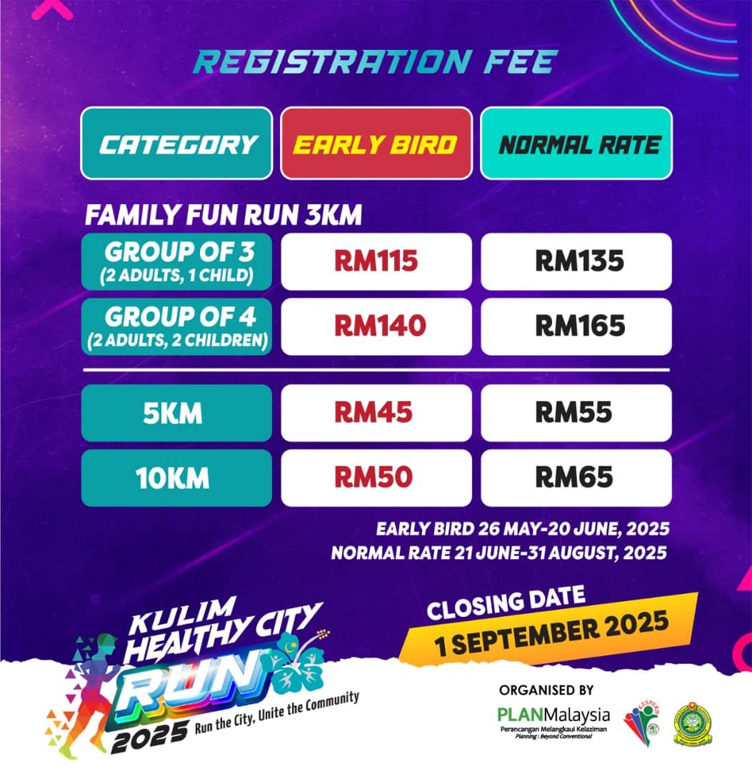 a community fun run in Kulim, Kedah on 11 October 2025, at scenic Taman Tasik Putra. With 3 km, 5 km, and 10 km categories, it’s perfect for families and fitness enthusiasts alike. Every runner gets a T‑shirt, finisher medal, and race kit, plus a shot at lucky draw prizes and 10 km winner awards.