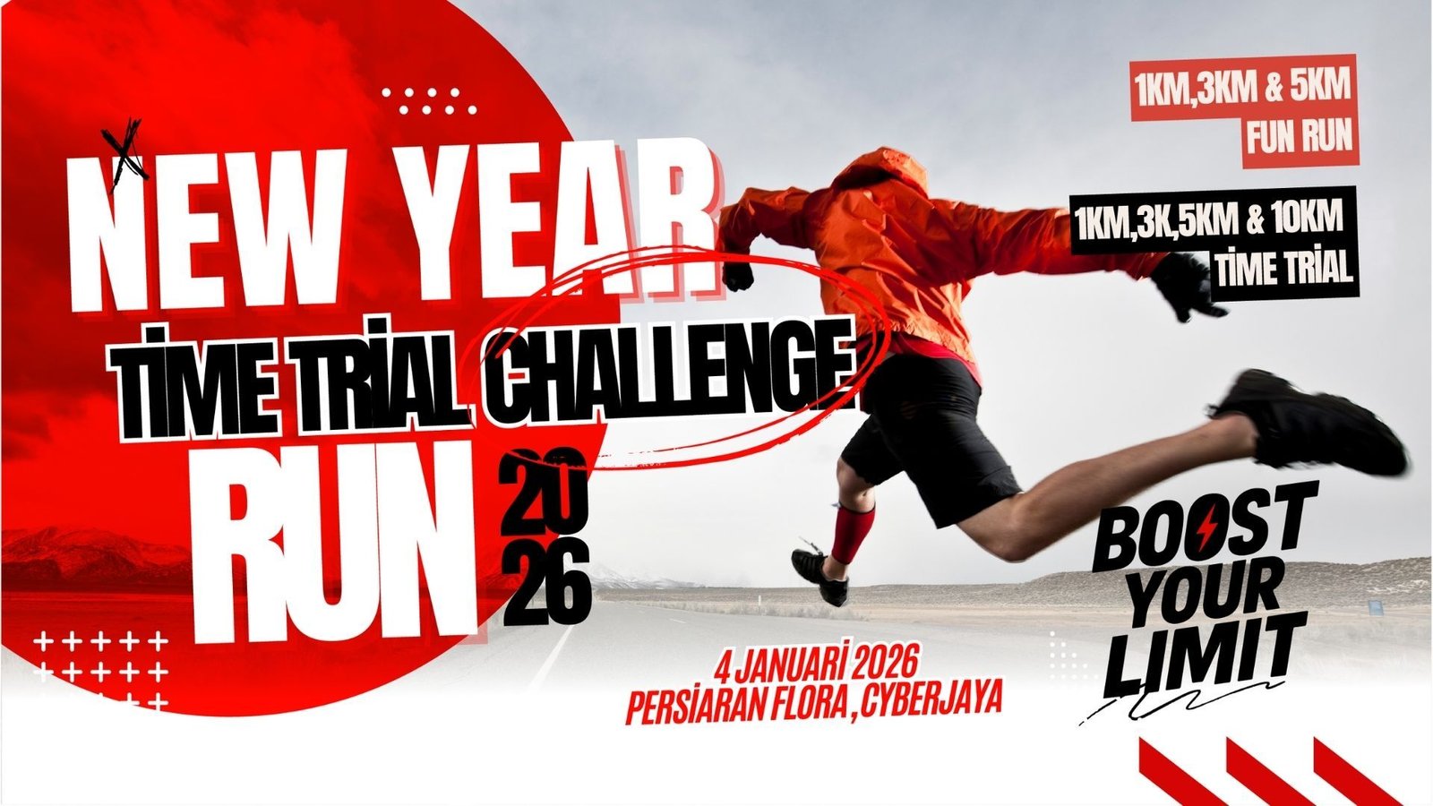 New Year Time Trial Challenge Run 2026 is a dynamic running challenge held on 3 January 2026 at Persiaran Flora, Cyberjaya. Designed as an exciting time trial event, it brings together runners for a high-energy, community-driven running experience. Registration is open from 5 August to 10 December 2025.