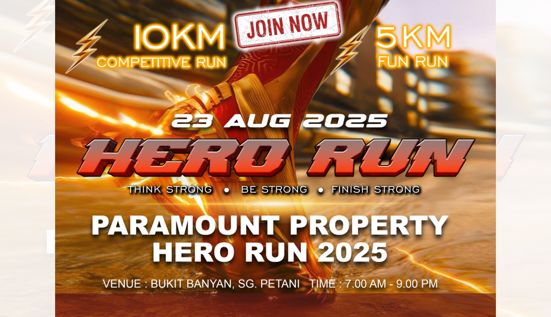The Paramount Property Hero Run 2025 is a high-energy fun run scheduled for 23 August 2025 in Sungai Petani, Kedah, hosted by Paramount Property in partnership with Corporate Hero and the Kedah State Youth & Sports Department. Participants can choose between 5 km and 10 km distances, aiming to foster community wellness, unity, and healthy lifestyles. Limited to 2,000 slots, the event includes race kits, finisher medals, and lucky draws, with registration closing on 15 July 2025 or when fully booked.
