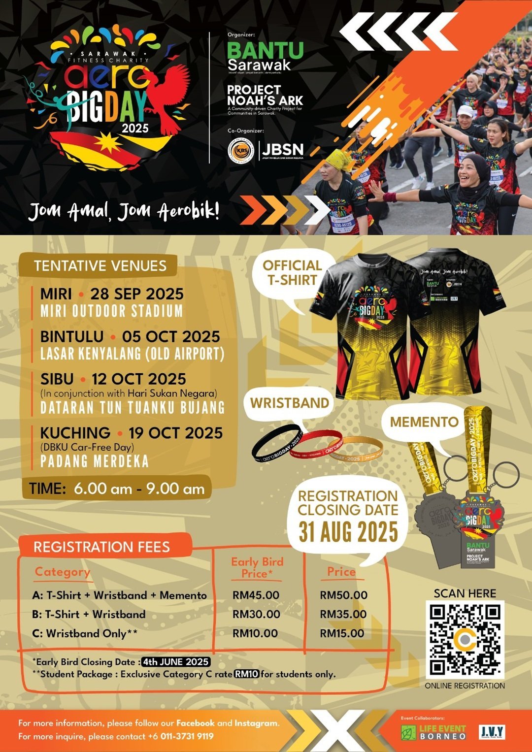 Sarawak AeroBig Day 2025 is a charity-driven fitness festival touring Miri, Bintulu, Sibu, and Kuching from 28 September to 19 October 2025. Organized by Bantu Sarawak with the Sarawak Youth & Sports Department and Life Event Borneo, this four-week aerobic event blends healthy living with goodwill. It aims to raise funds for marginalized communities, targeting around 3,500 participants across Sarawak .