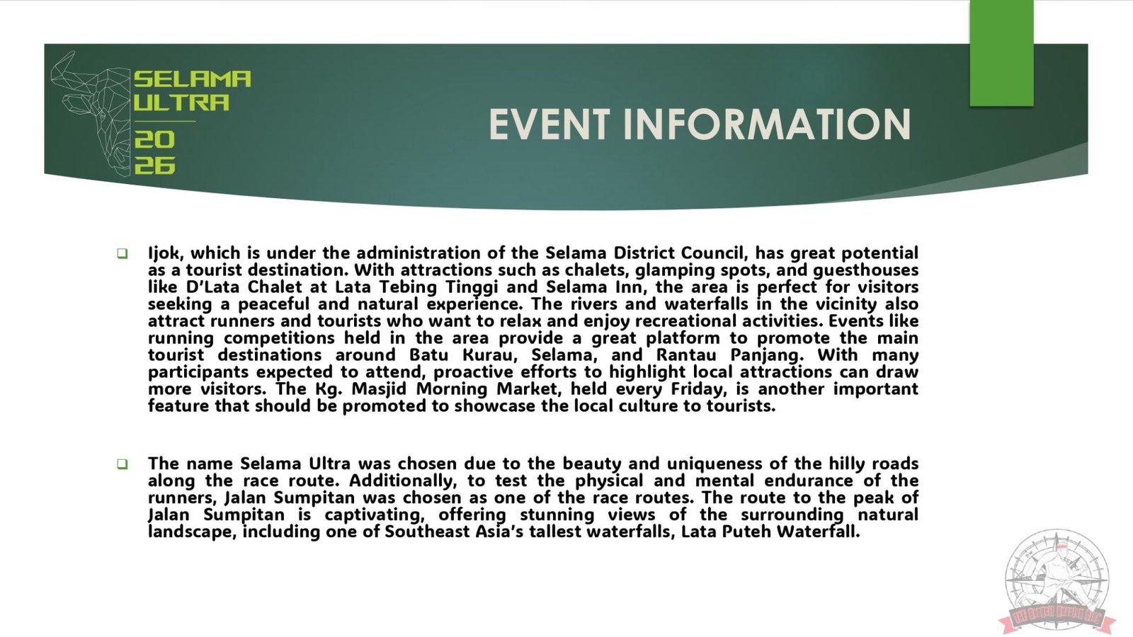 Selama Ultra 2026 is a celebrated trail-running festival unfolding from 31 January to 1 February 2026 at Padang Bola Kampung Masjid Ijok, Selama, Perak. This immersive ultramarathon spans multiple categories, combining endurance, nature, and camaraderie in one unforgettable weekend.