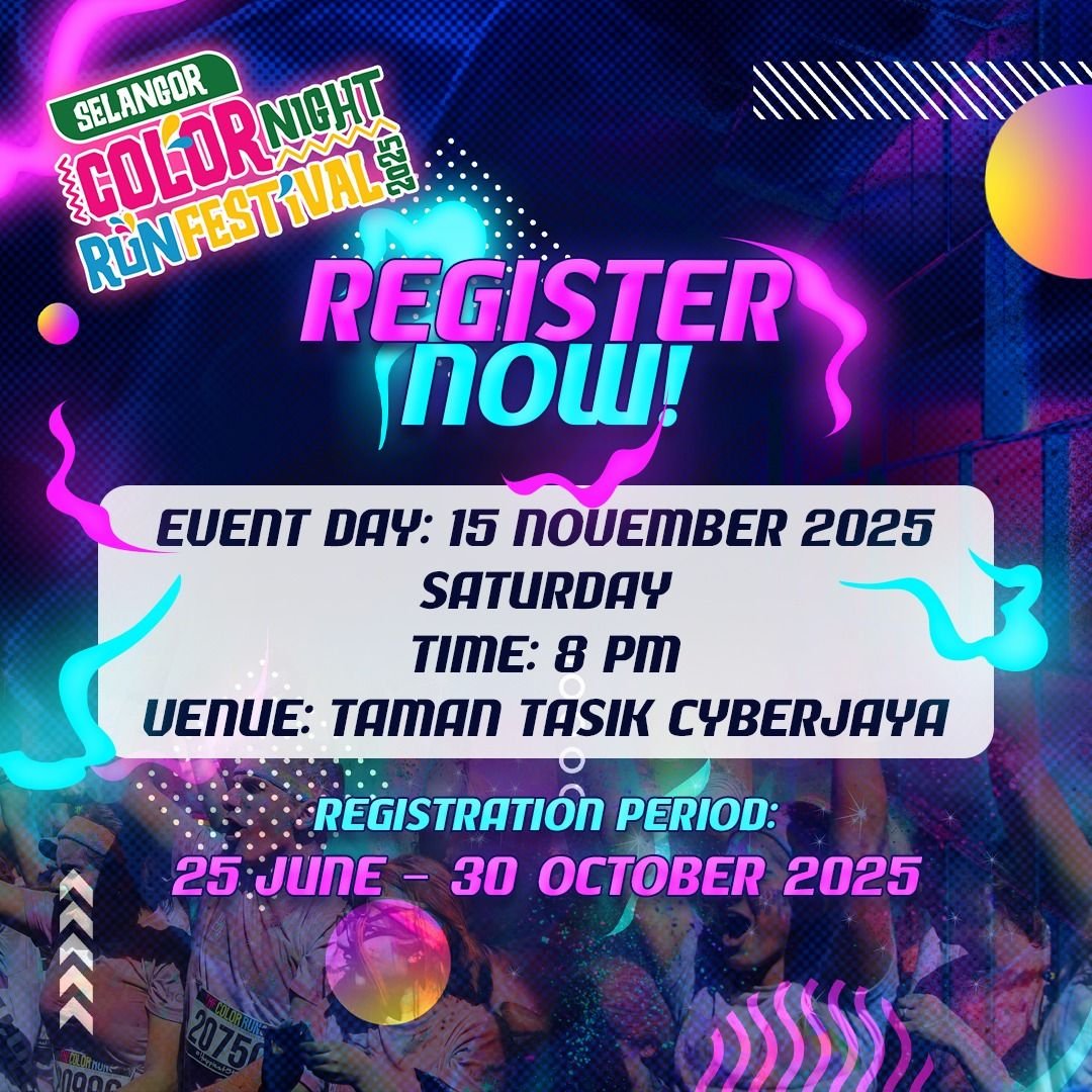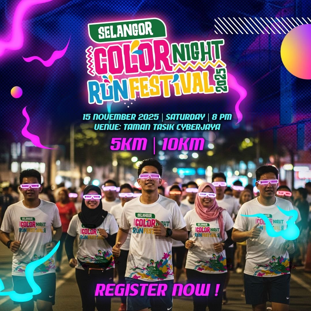 Selangor Color Night Run Festival 2025 Cyberjaya is a thrilling night run filled with vibrant colors, music, and festive energy. Experience an unforgettable evening as runners of all ages light up the streets of Cyberjaya, combining fitness, fun, and community celebration in this spectacular 2025 event.