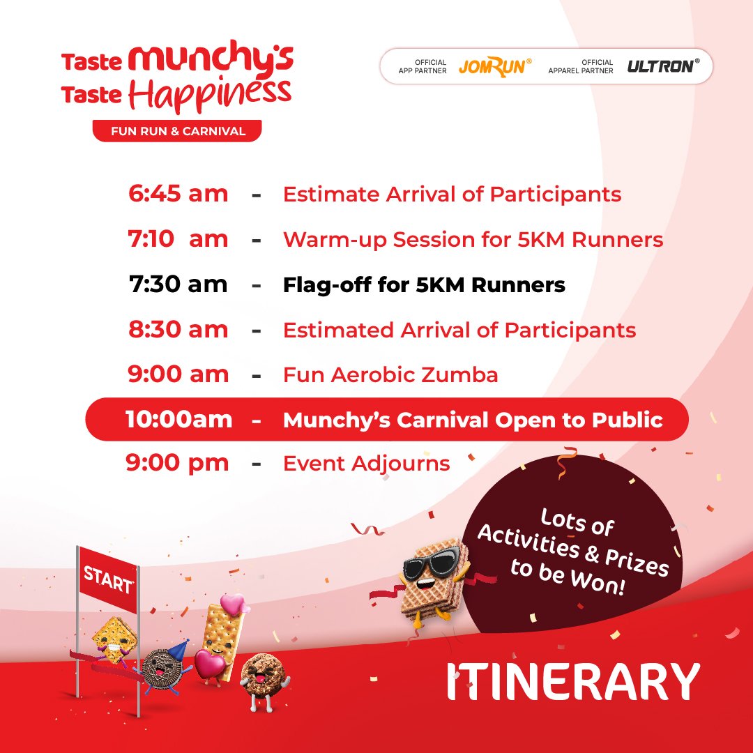 a lively, family-friendly event combining fitness, food, and fun! Join us for an exciting fun run followed by a vibrant carnival filled with delicious Munchy’s snacks, interactive games, live entertainment, and activities for all ages. Perfect for families, friends, and snack lovers, this 2025 event is your chance to run, laugh, and indulge in happiness. Don’t miss the ultimate blend of health and enjoyment at the Taste Munchy’s Taste Happiness Fun Run & Carnival 2025 – where every step and bite brings joy!