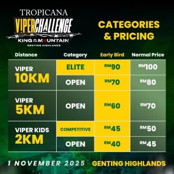 The Tropicana Viper Challenge, also billed as Viper Challenge: King of the Mountain, is a pulse-pounding obstacle run slated for 1 November 2025 at Tropicana WindCity, Genting Highlands. As part of the Viper Challenge series—Asia’s largest and most iconic obstacle racing event—this adrenaline-fueled adventure invites participants to scale, slide, crawl, and conquer their limits across a dynamic course of progressive obstacles.