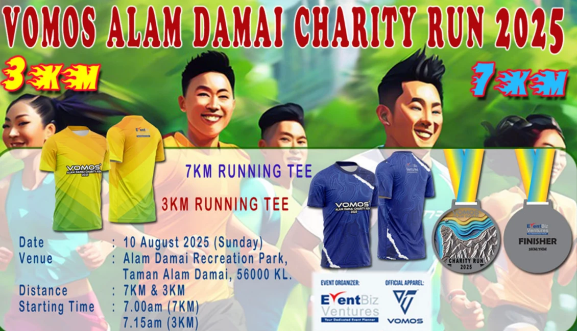 Vomos Alam Damai Charity Run 2025 is a community-focused running event promoting health and togetherness. Held in Kuala Lumpur, it features fun and competitive categories suitable for all ages, with proceeds supporting charitable causes.