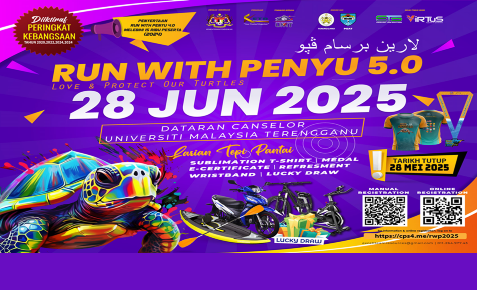 Run With Penyu 5.0 is a community-focused 5 km fun run dedicated to turtle conservation. Scheduled for 28 June 2025 at Dataran Canselor, Universiti Malaysia Terengganu, the event offers both physical and virtual participation options. Participants receive a dry-fit T-shirt, personalized...