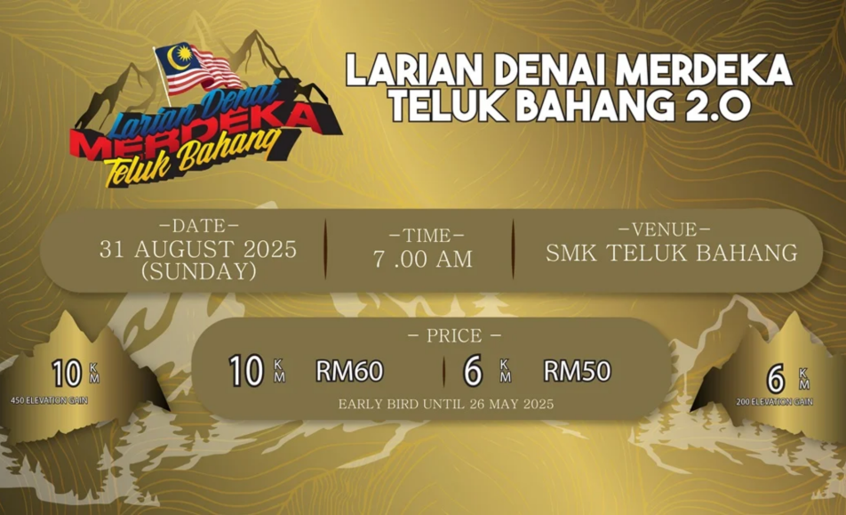 Larian Denai Merdeka Teluk Bahang 2.0 (2025) is a community-focused trail run held on 31 August 2025 at SMK Teluk Bahang, Penang. With two scenic distances—6 km (160 m climb) and 10 km (480 m climb)—it’s designed to spark appreciation for nature while celebrating Malaysia’s...