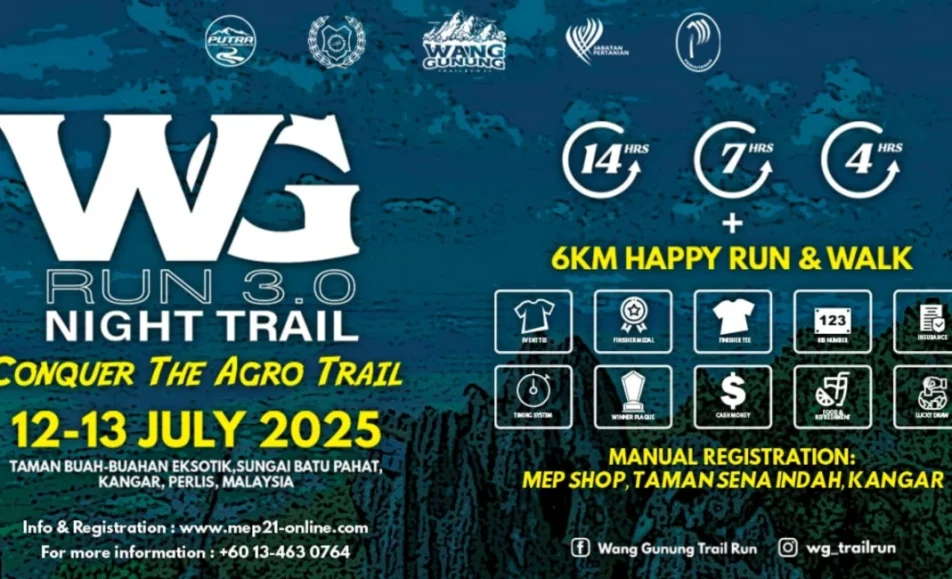 Wang Gunung Night Trail Run 2025 takes place on 12–13 July 2025 at Taman Buah‑buahan Eksotik, Perlis. Hosted by Putra Trail Running Club, it’s a unique night-time trail challenge featuring looped endurance categories (4h, 7h, 14h) alongside fun walk/run options. Participants...